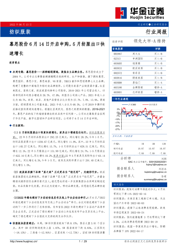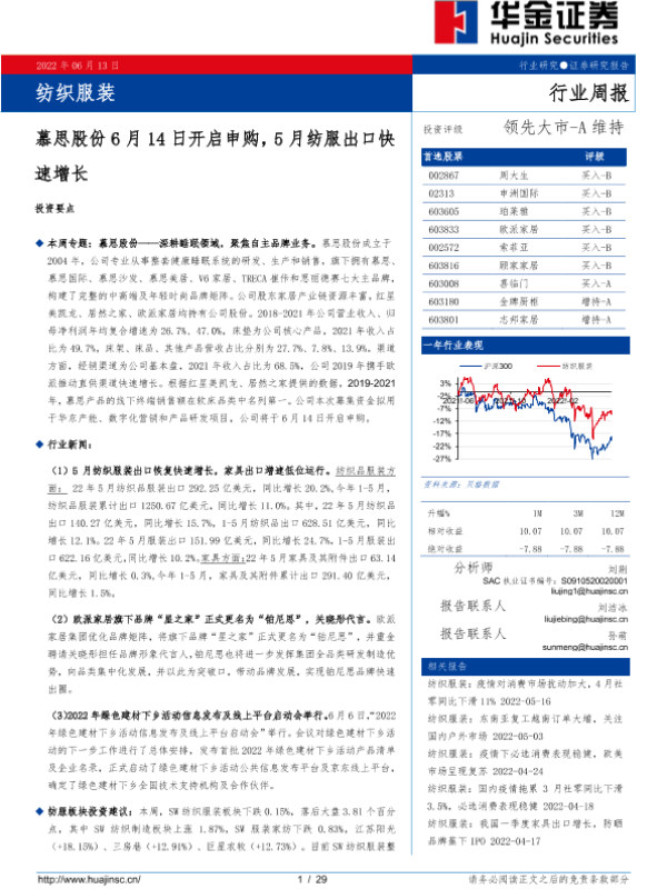【华金证券】【20220613】20220613-华金证券-纺织服装行业周报:慕思股份6月14日开启申购,5月纺服出口快速增长-29页