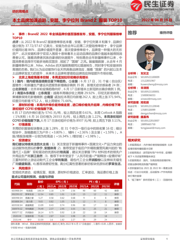 【民生证券】【20220619】20220619-民生证券-纺织周观点:本土品牌加速追赶,安踏、李宁位列BrandZ服装TOP10-23页