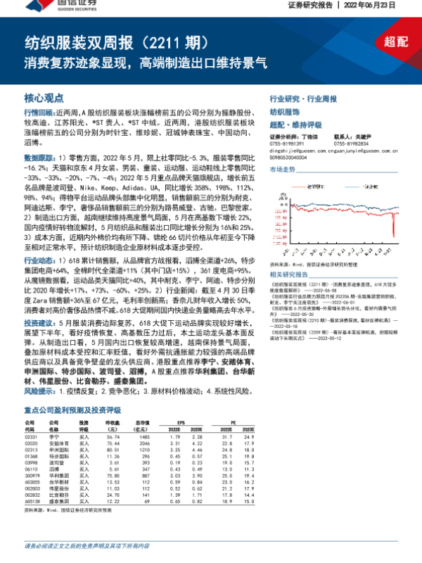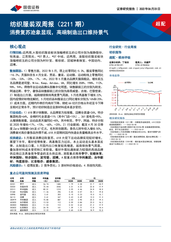 【国信证券】【20220623】20220623-国信证券-纺织服装双周报(2211期):消费复苏迹象显现,高端制造出口维持景气-17页