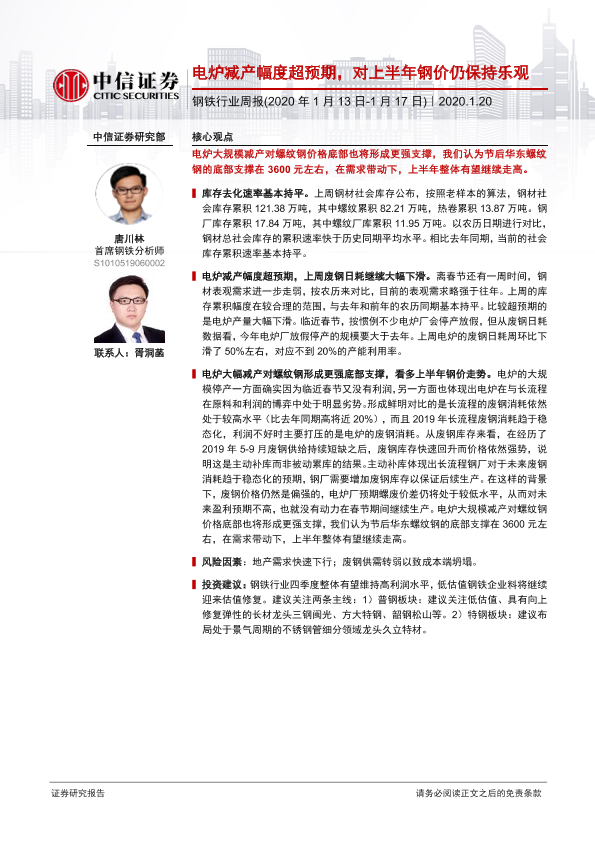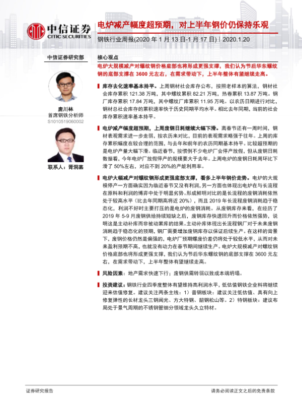 【中信证券】【20200120】20200120-中信证券-钢铁行业周报:电炉减产幅度超预期,对上半年钢价仍保持乐观-13页