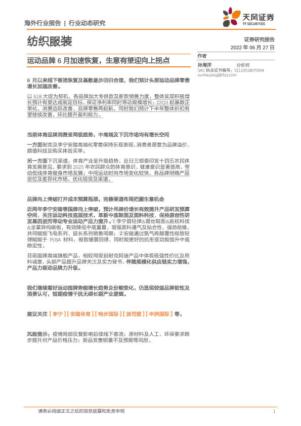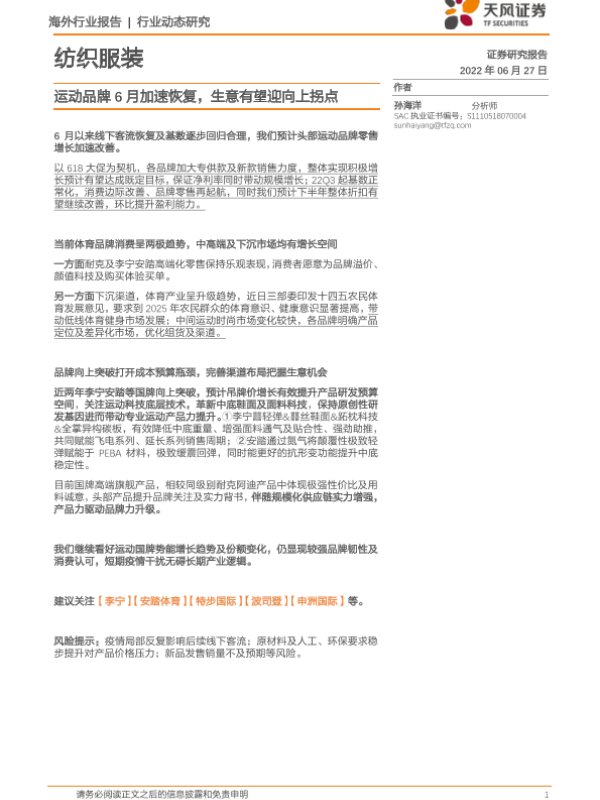 【天风证券】【20220627】纺织服装行业动态研究:运动品牌6月加速恢复,生意有望迎向上拐点-2页