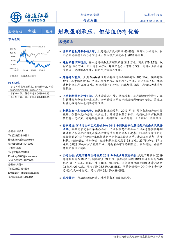 【海通证券】【20200120】20200120-海通证券-钢铁行业周报:短期盈利承压,但估值仍有优势-14页