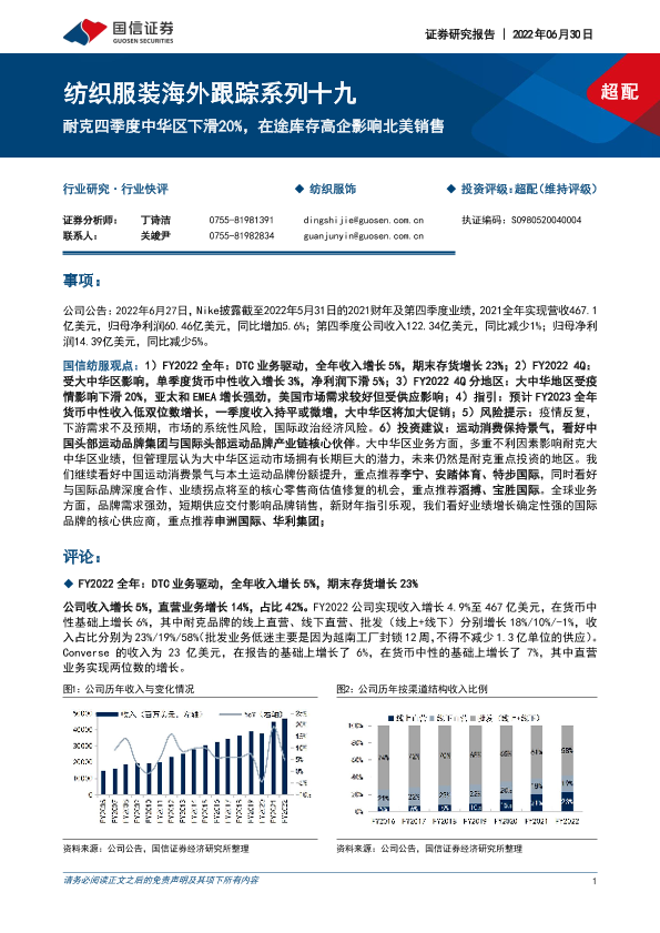 【国信证券】【20220630】纺织服装海外跟踪系列十九:耐克四季度中华区下滑20%,在途库存高企影响北美销售-9页