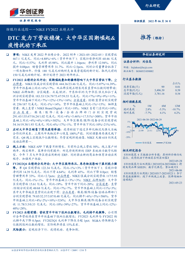 【华创证券】【20220630】纺服行业追踪:NIKE FY2022业绩点评-DTC发力下营收稳健,大中华区国潮崛起&疫情扰动下承压-9页