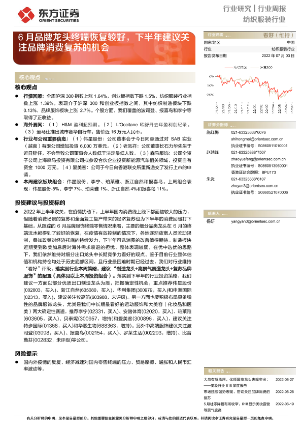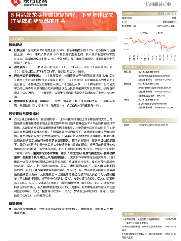 【东方证券】【20220703】20220703-东方证券-纺织服装行业周报:6月品牌龙头终端恢复较好,下半年建议关注品牌消费复苏的机会-7页