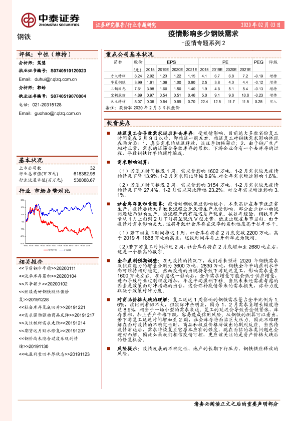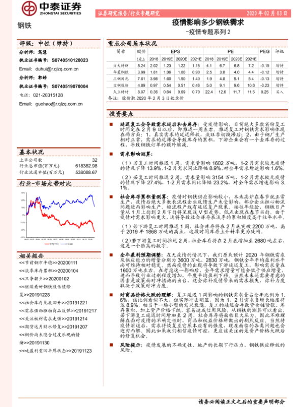 【中泰证券】【20200203】钢铁:疫情专题系列2:疫情影响多少钢铁需求-8页
