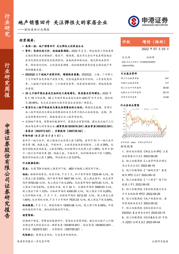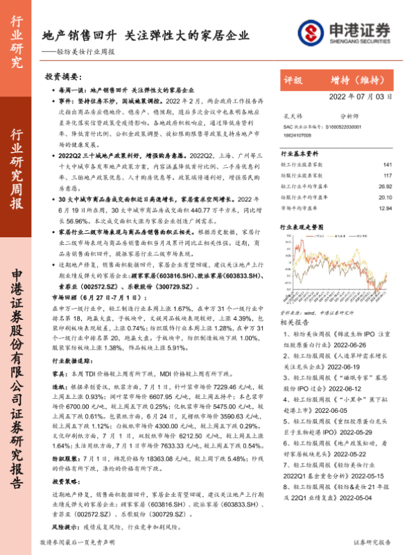 【申港证券】【20220703】20220703-申港证券-轻纺美妆行业周报:地产销售回升 关注弹性大的家居企业-15页