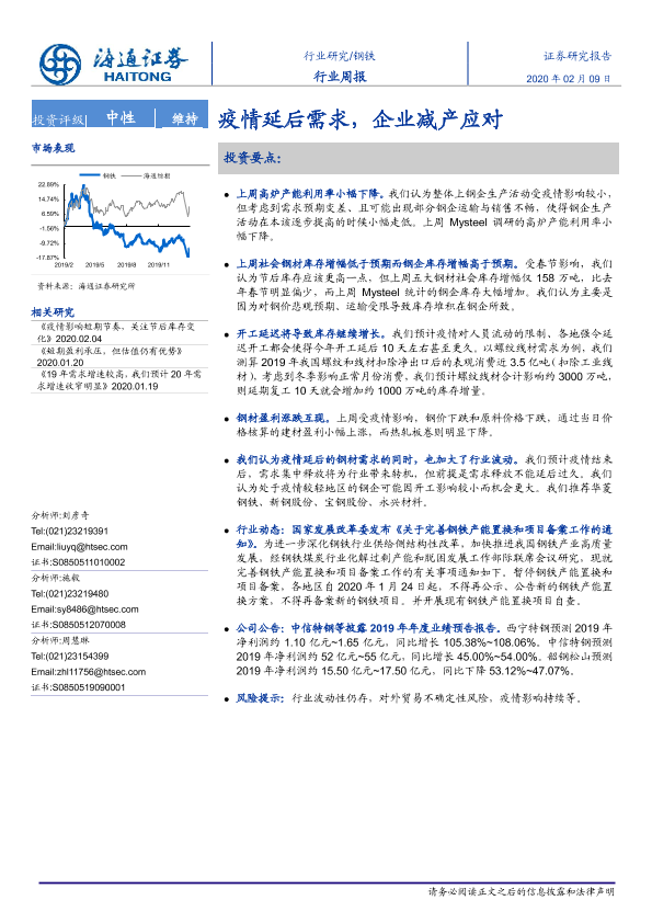 【海通证券】【20200209】20200209-海通证券-钢铁行业周报:疫情延后需求,企业减产应对-14页