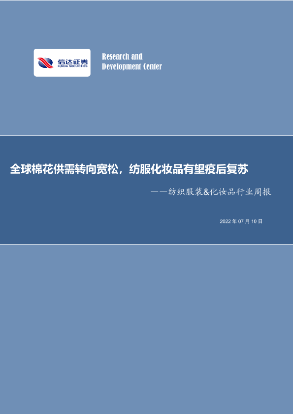 【信达证券】【20220710】全球棉花供需转向宽松,纺服化妆品有望疫后复苏-14页