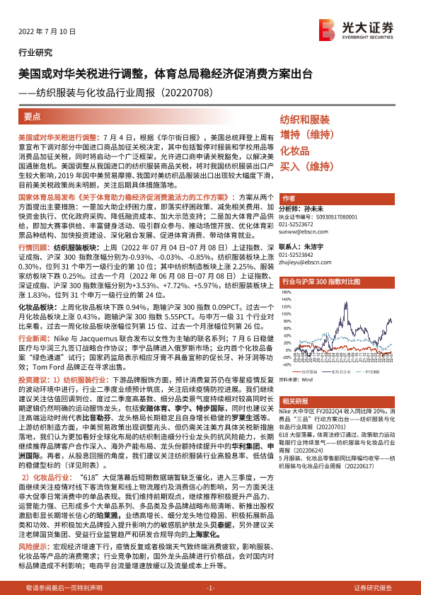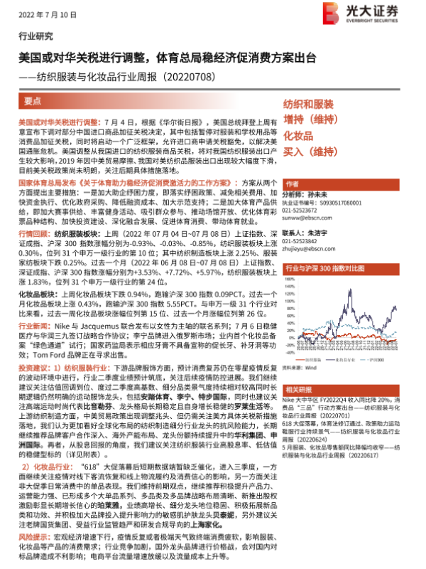 【光大证券】【20220710】20220710-光大证券-纺织服装与化妆品行业周报:美国或对华关税进行调整,体育总局稳经济促消费方案出台-12页