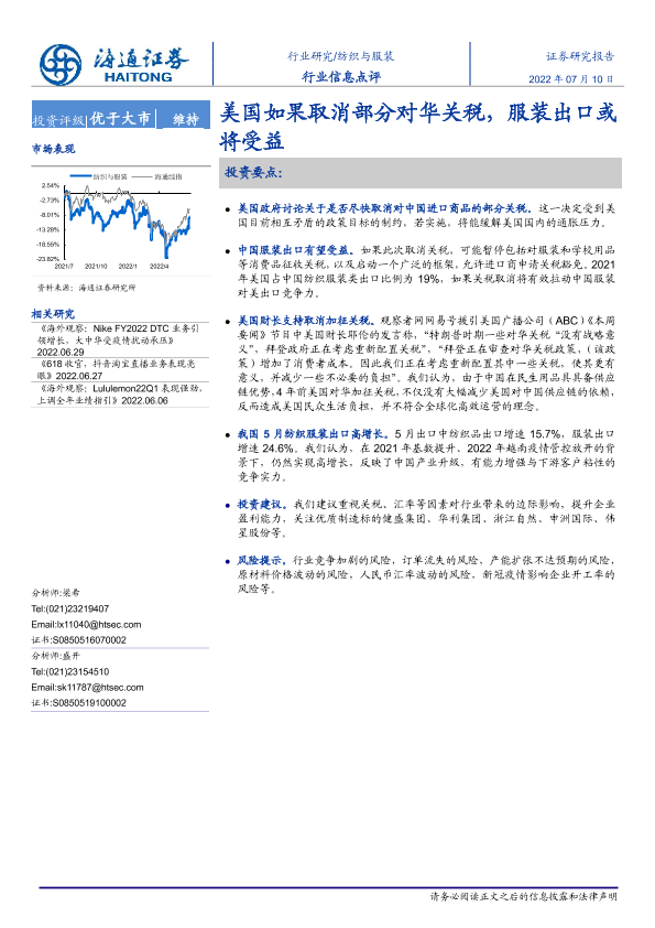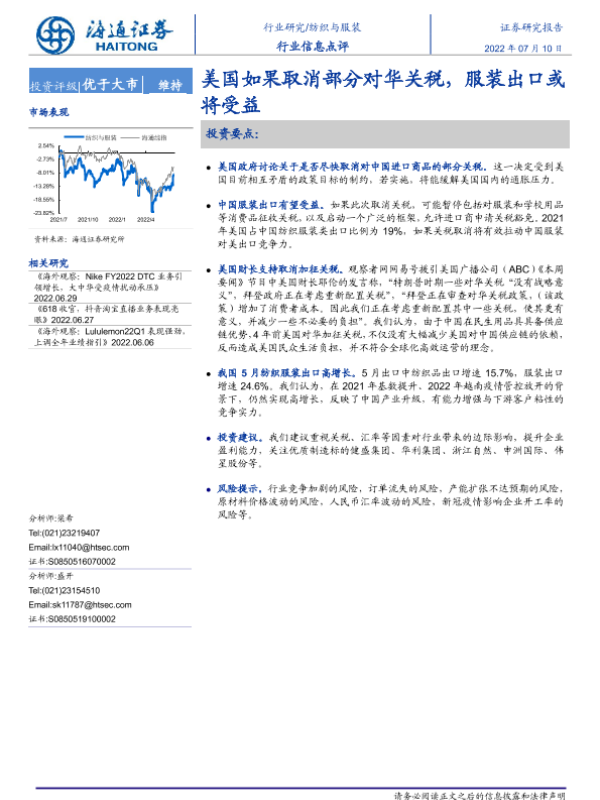 【海通证券】【20220710】纺织与服装行业信息点评:美国如果取消部分对华关税,服装出口或将受益-2页