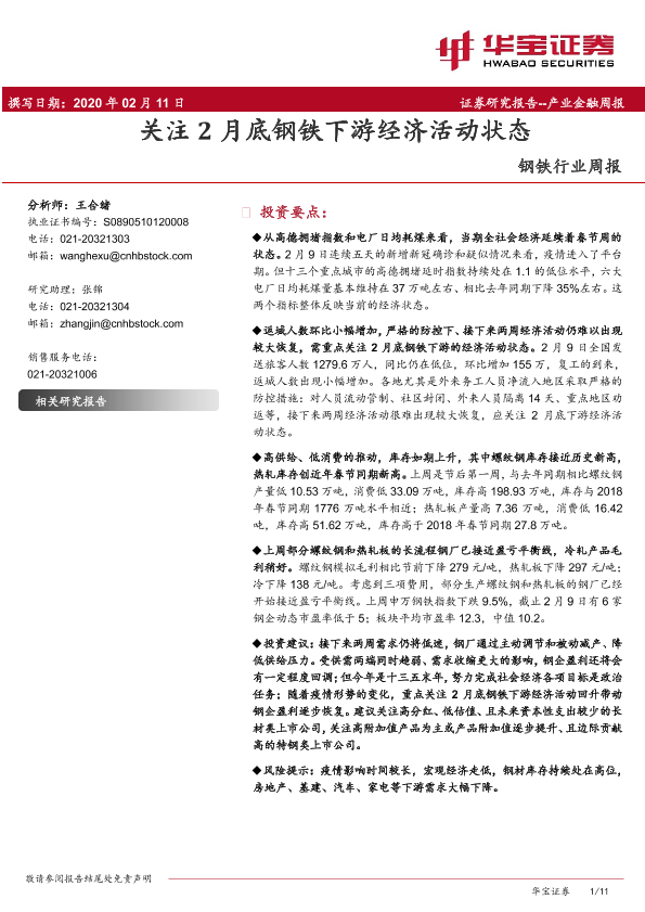 【华宝证券】【20200211】20200211-华宝证券-钢铁行业周报:关注2月底钢铁下游经济活动状态-11页
