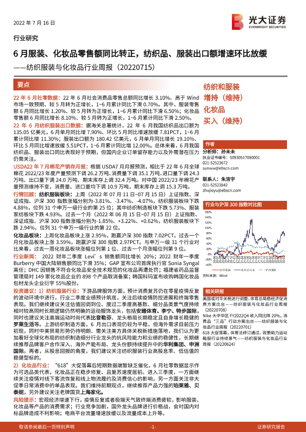 【光大证券】【20220716】20220716-光大证券-纺织服装与化妆品行业周报:6月服装、化妆品零售额同比转正,纺织品、服装出口额增速环比放缓-13页