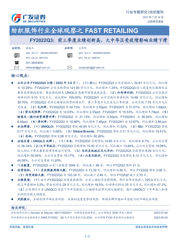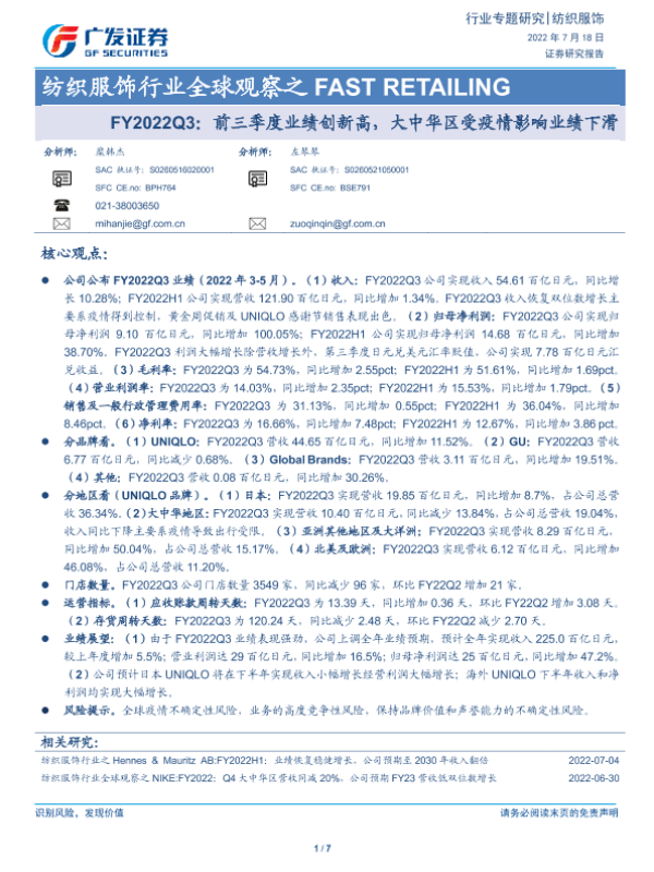 【广发证券】【20220718】纺织服饰行业全球观察之 FAST RETAILING:FY2022Q3:前三季度业绩创新高,大中华区受疫情影响业绩下滑-7页