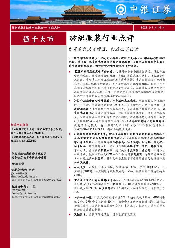 【中银证券】【20220718】纺织服装行业点评:6月零售改善明显,行业低谷已过-18页