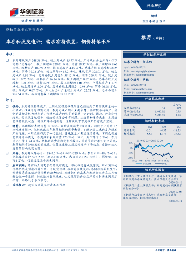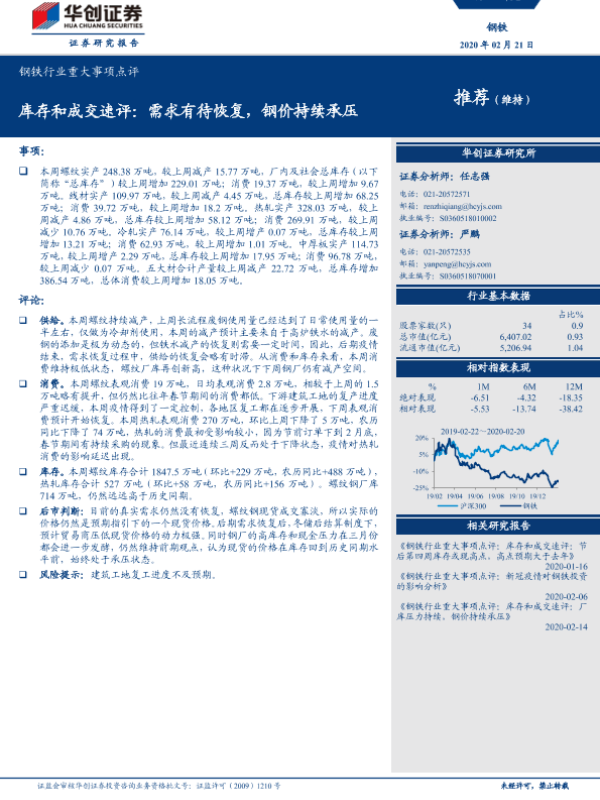 【华创证券】【20200221】钢铁行业重大事项点评:库存和成交速评:需求有待恢复,钢价持续承压-4页