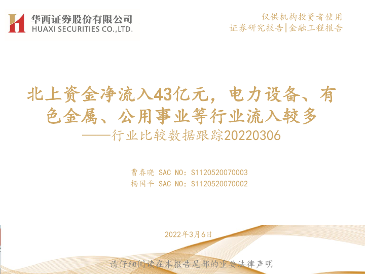 【华西证券】【20220306】行业比较数据跟踪:北上资金净流入43亿元,电力设备、有色金属、公用事业等行业流入较多-22页