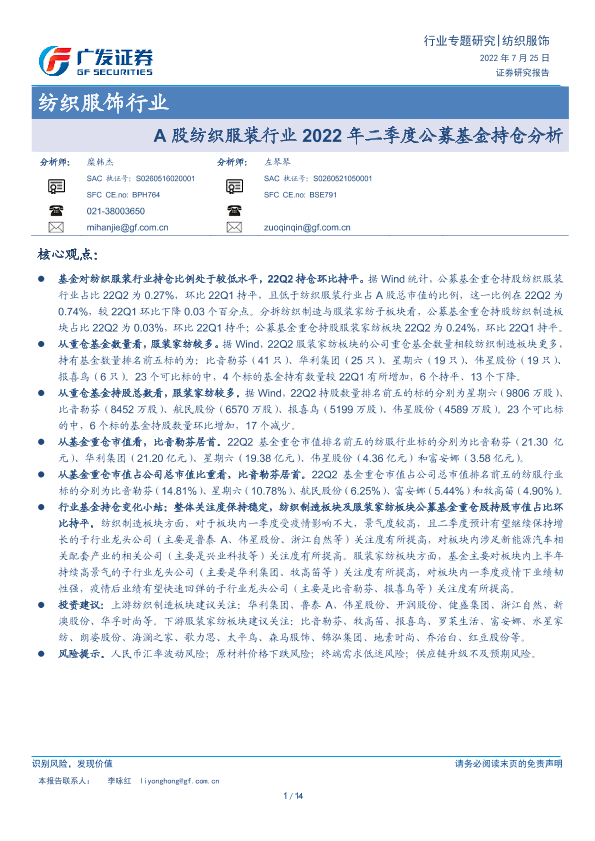 【广发证券】【20220725】A股纺织服装行业2022年二季度公募基金持仓分析-14页