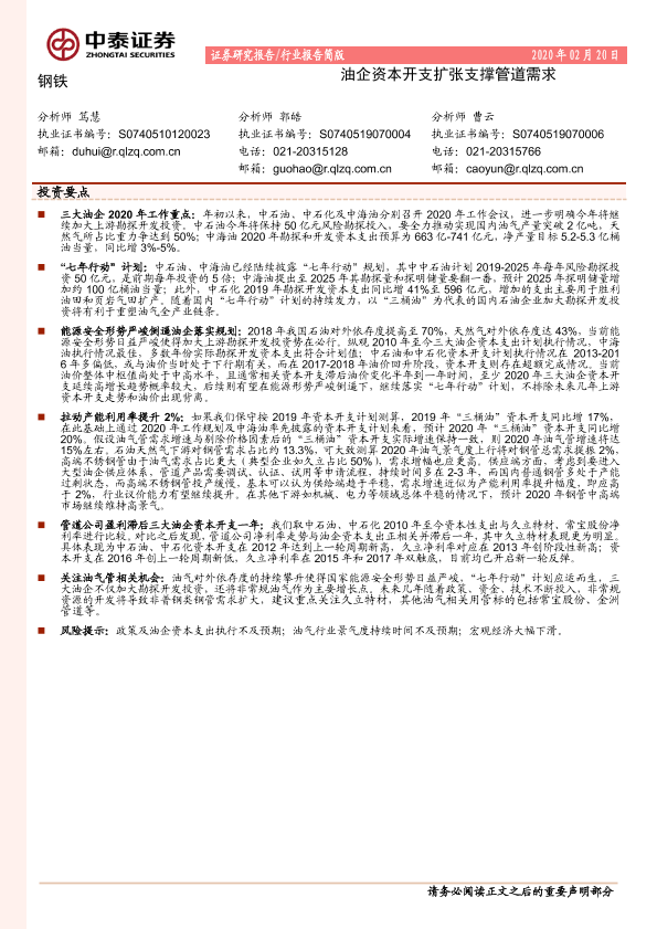 【中泰证券】【20200220】钢铁:油企资本开支扩张支撑管道需求-7页
