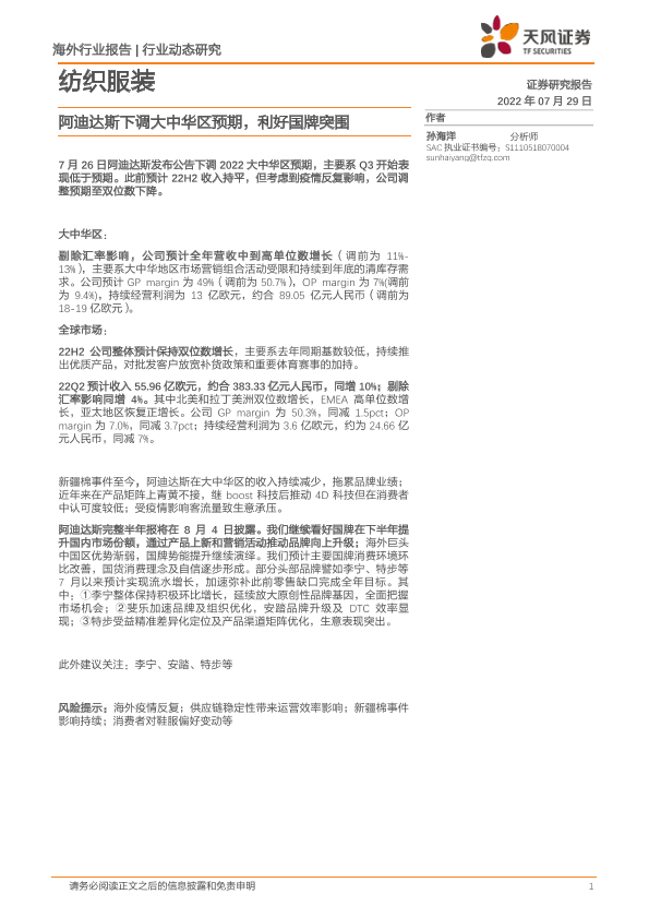 【天风证券】【20220729】纺织服装行业动态研究:阿迪达斯下调大中华区预期,利好国牌突围-4页