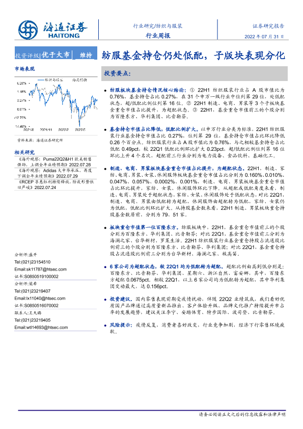 【海通证券】【20220731】20220731-海通证券-纺织与服装行业周报:纺服基金持仓仍处低配,子版块表现分化-10页