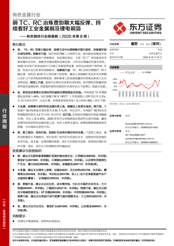 【东方证券】【20200223】20200223-东方证券-有色钢铁行业周策略(2020年第8周):铜 TC、RC冶炼费如期大幅反弹、持续看好工业金属铜及锂电铜箔-27页