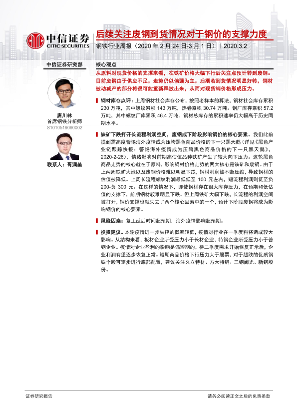 【中信证券】【20200302】20200302-中信证券-钢铁行业周报:后续关注废钢到货情况对于钢价的支撑力度-13页