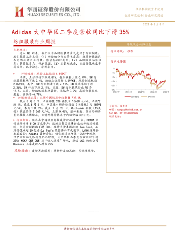 【华西证券】【20220808】20220808-华西证券-纺织服装行业周报:Adidas大中华区二季度营收同比下滑35%-24页