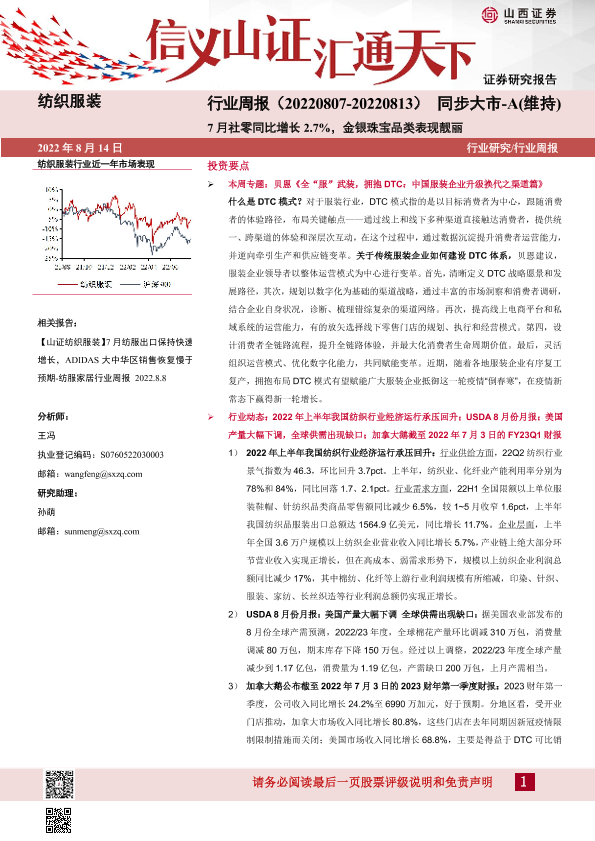 【山西证券】【20220814】纺织服装行业周报:7月社零同比增长2.7%,金银珠宝品类表现靓丽-22页