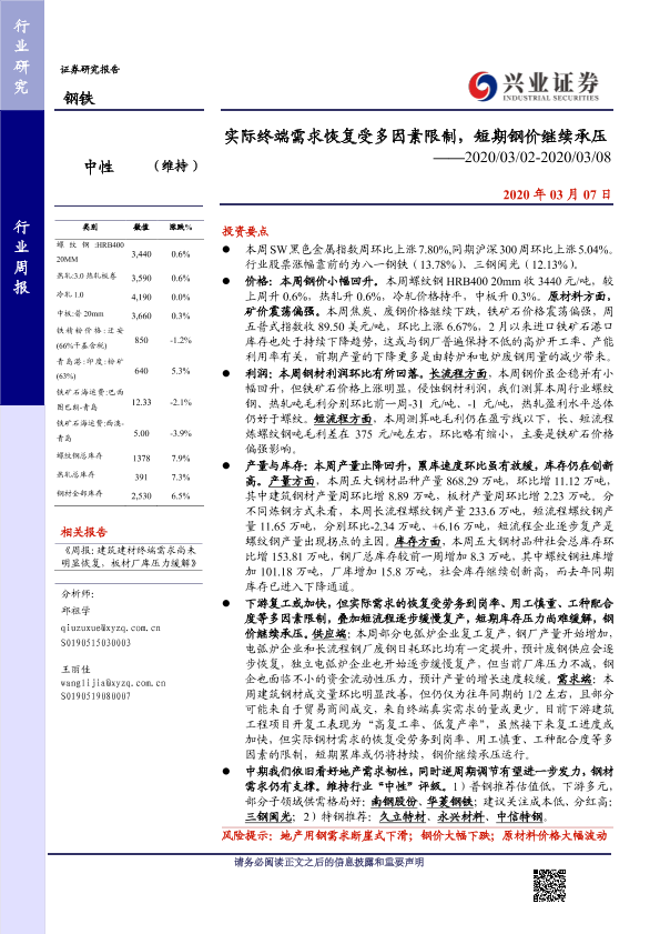 【兴业证券】【20200307】实际终端需求恢复受多因素限制,短期钢价继续承压-17页