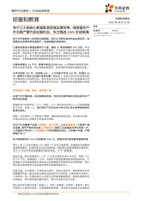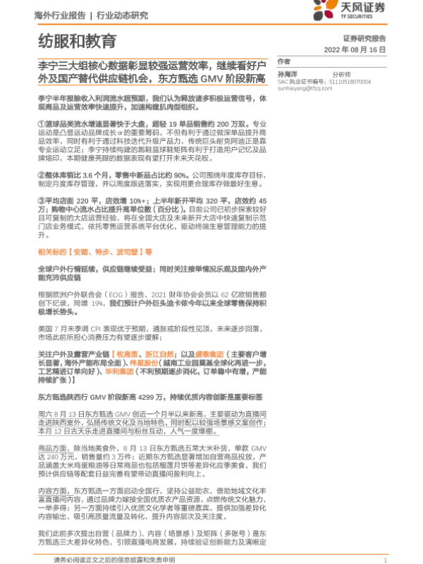 【天风证券】【20220816】纺服和教育:李宁三大组核心数据彰显较强运营效率,继续看好户外及国产替代供应链机会,东方甄选GMV阶段新高-3页