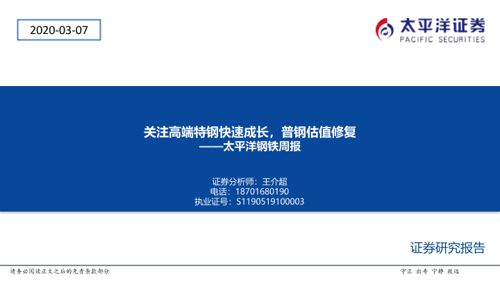 【太平洋证券】【20200307】20200307-太平洋-钢铁周报:关注高端特钢快速成长,普钢估值修复-43页