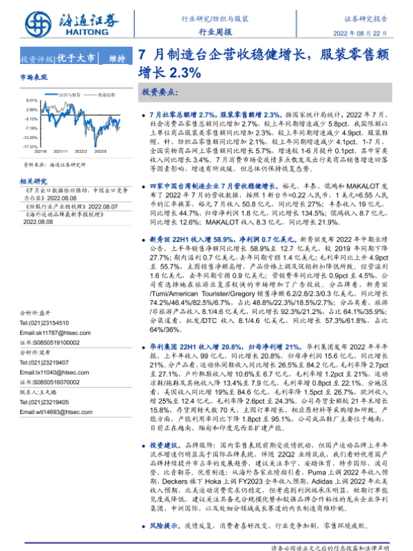 【海通证券】【20220822】20220822-海通证券-纺织与服装行业周报:7月制造台企营收稳健增长,服装零售额增长2.3%-11页
