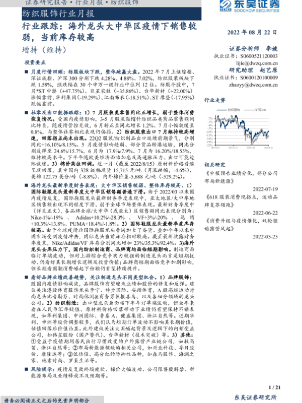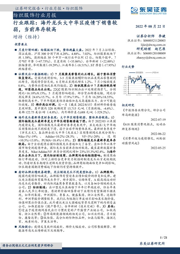 【东吴证券】【20220822】20220822-东吴证券-纺织服饰行业月报:行业跟踪:海外龙头大中华区疫情下销售较弱,当前库存较高-21页