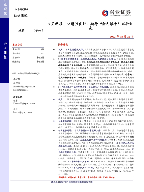 【兴业证券】【20220822】20220822-兴业证券-纺织服装行业周报:7月纺服出口增长良好,期待“金九银十”旺季到来-16页