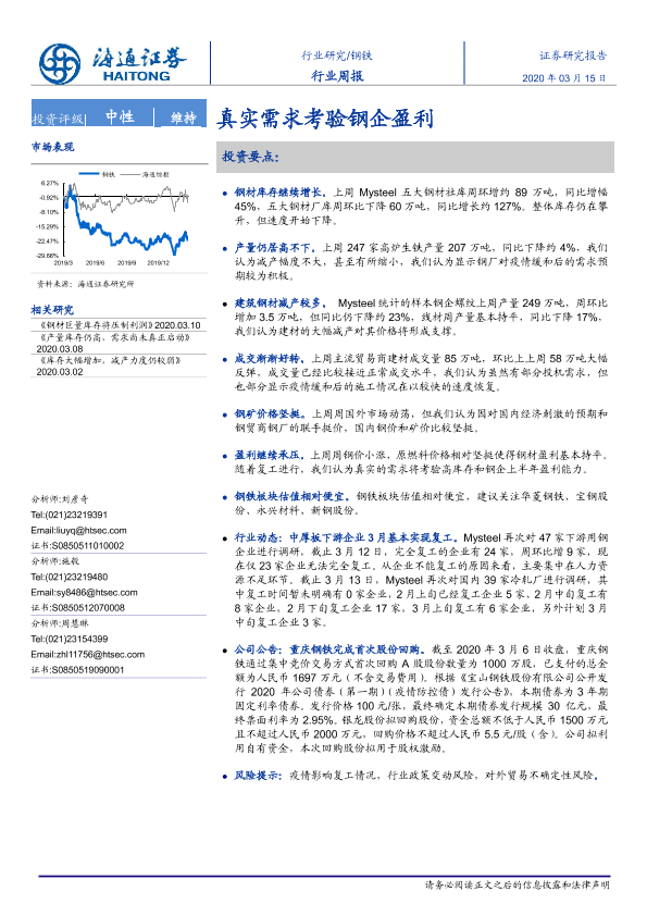 【海通证券】【20200315】20200315-海通证券-钢铁行业周报:真实需求考验钢企盈利-14页