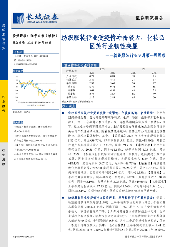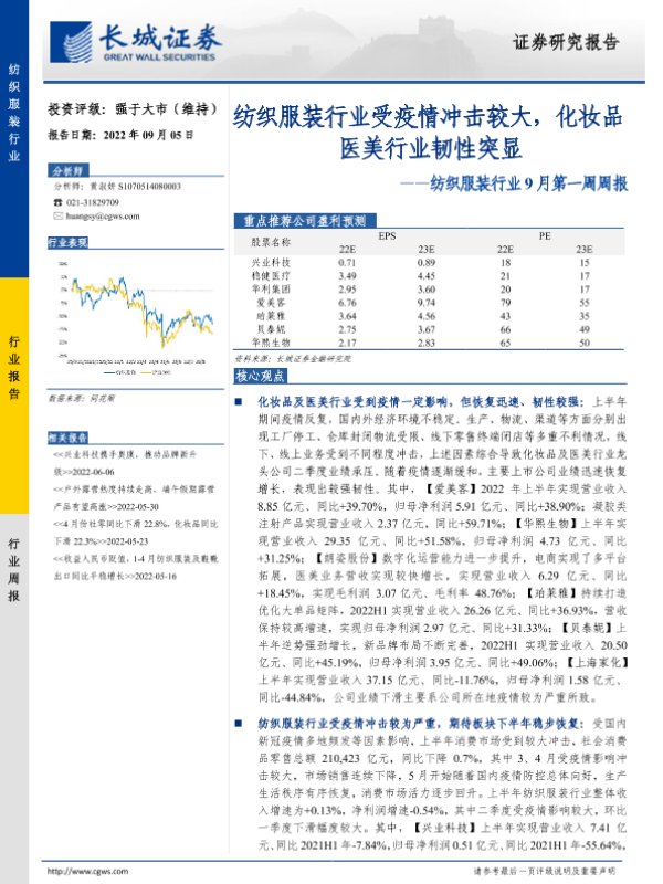 【长城证券】【20220905】20220905-长城证券-纺织服装行业9月第一周周报:纺织服装行业受疫情冲击较大,化妆品医美行业韧性突显-13页