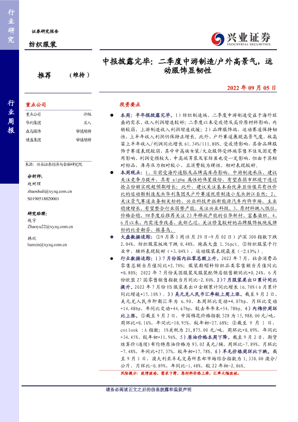 【兴业证券】【20220905】20220905-兴业证券-纺织服装行业周报:中报披露完毕:二季度中游制造 户外高景气,运动服饰显韧性-18页