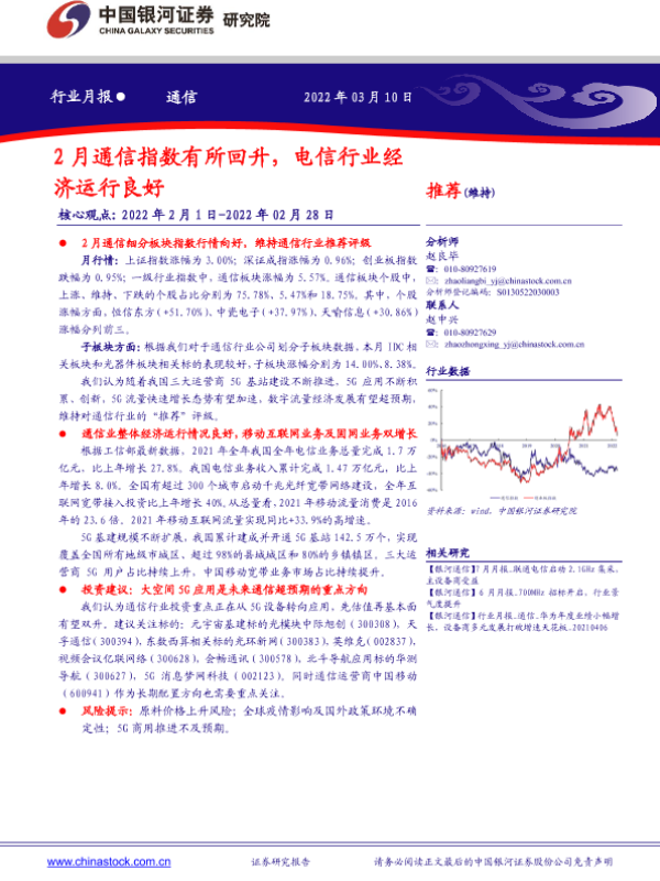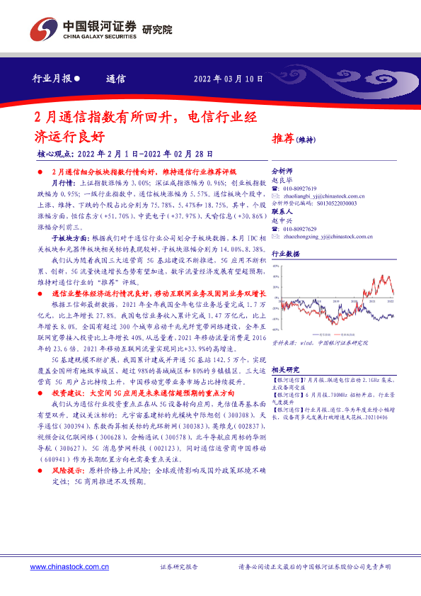 【银河证券】【20220310】通信行业月报:2月通信指数有所回升,电信行业经济运行良好-16页
