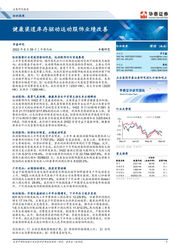 【华泰证券】【20220909】纺织服装专题研究:健康渠道库存驱动运动服饰业绩改善-20页