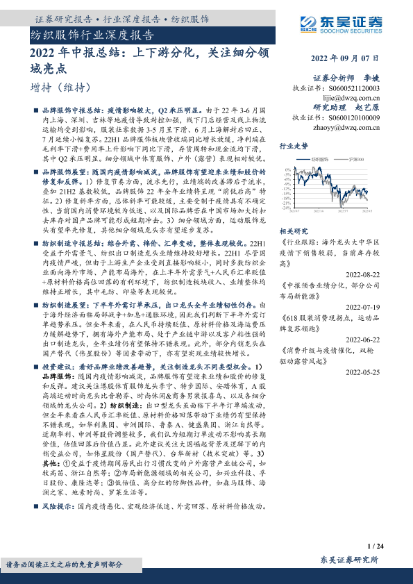 中报总结 疫情影响 纺织服饰 细分领域 行业分析