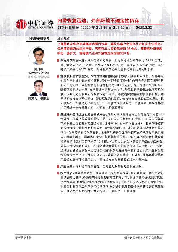 【中信证券】【20200323】钢铁行业周报:内需恢复迅速,外部环境不确定性仍存-13页