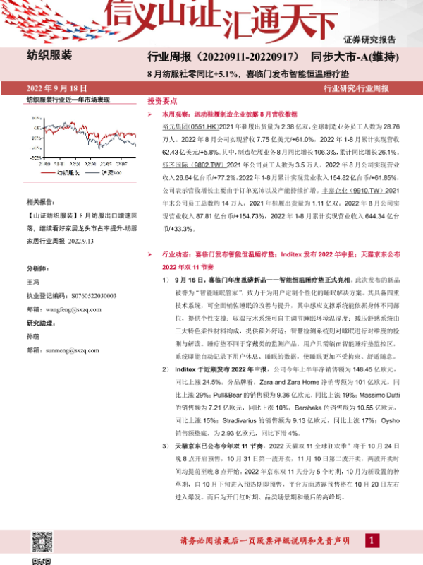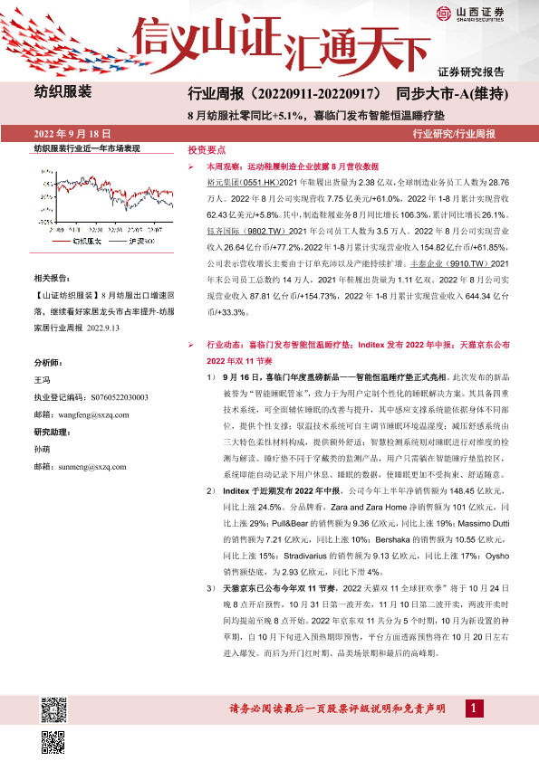 【山西证券】【20220918】纺织服装行业周报:8月纺服社零同比+5.1%,喜临门发布智能恒温睡疗垫-21页