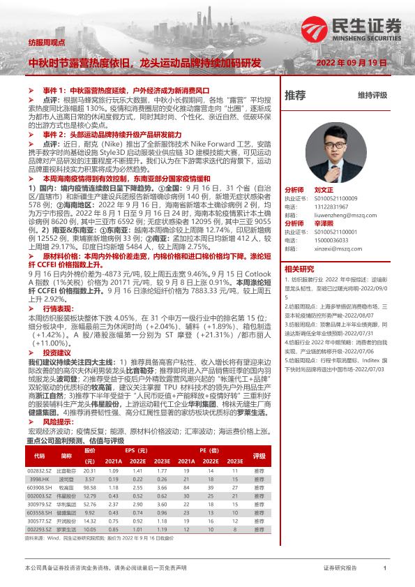 原材料价格 疫情跟踪 纺织服装零售 运动品牌研发 露营热度