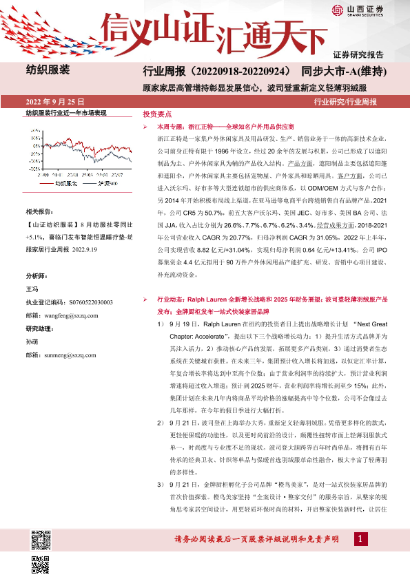 【山西证券】【20220925】纺织服装行业周报:顾家家居高管增持彰显发展信心,波司登重新定义轻薄羽绒服-26页