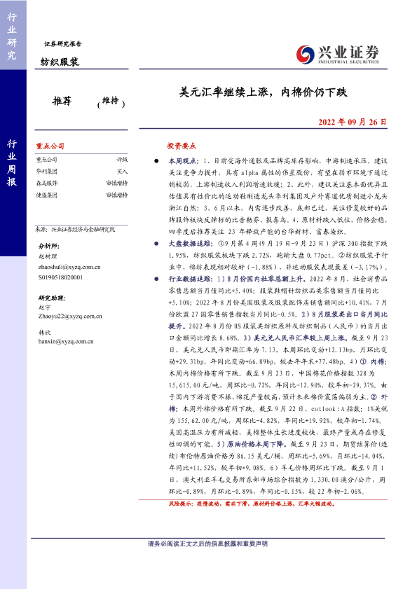 【兴业证券】【20220926】20220926-兴业证券-纺织服装行业周报:美元汇率继续上涨,内棉价仍下跌-15页