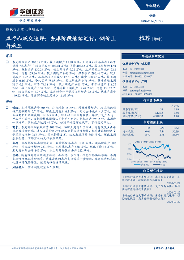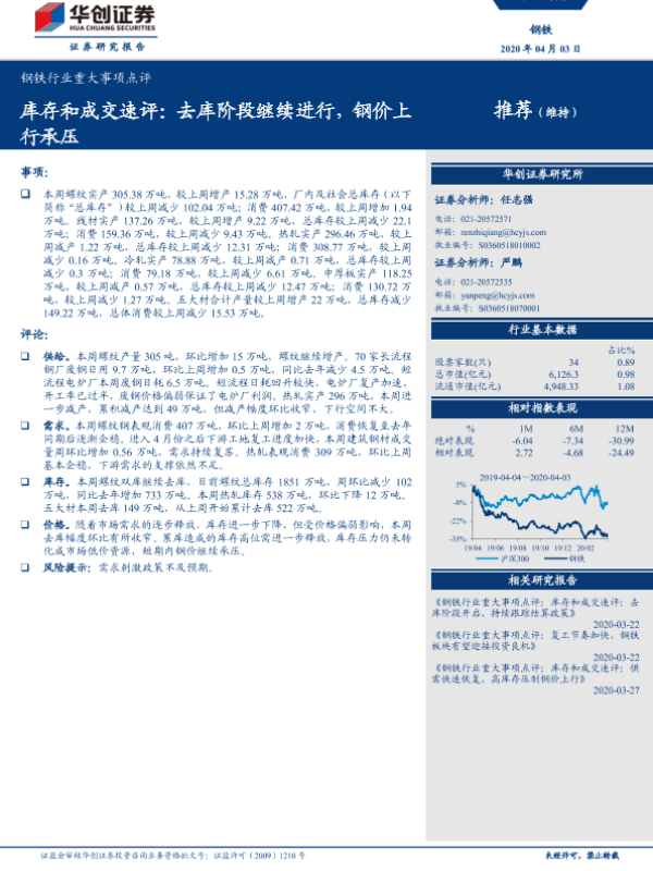 【华创证券】【20200403】钢铁行业重大事项点评:库存和成交速评:去库阶段继续进行,钢价上行承压-3页