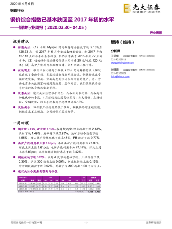 【光大证券】【20200406】20200406-光大证券-钢铁行业周报:钢价综合指数已基本跌回至2017年初的水平-8页
