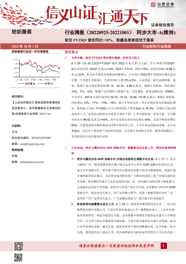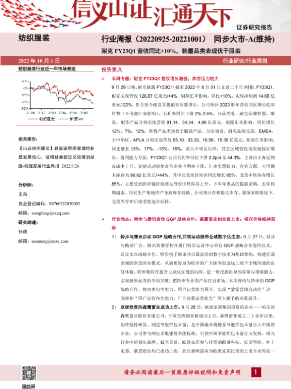 【山西证券】【20221001】20221001-山西证券-纺织服装行业周报:耐克FY23Q1营收同比+10%,鞋履品类表现优于服装-22页