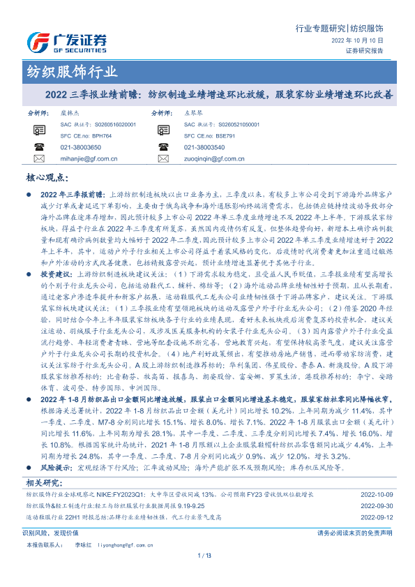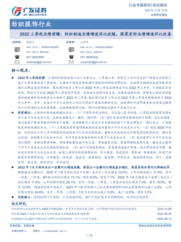 【广发证券】【20221010】纺织服饰行业2022三季报业绩前瞻:纺织制造业绩增速环比放缓,服装家纺业绩增速环比改善-13页